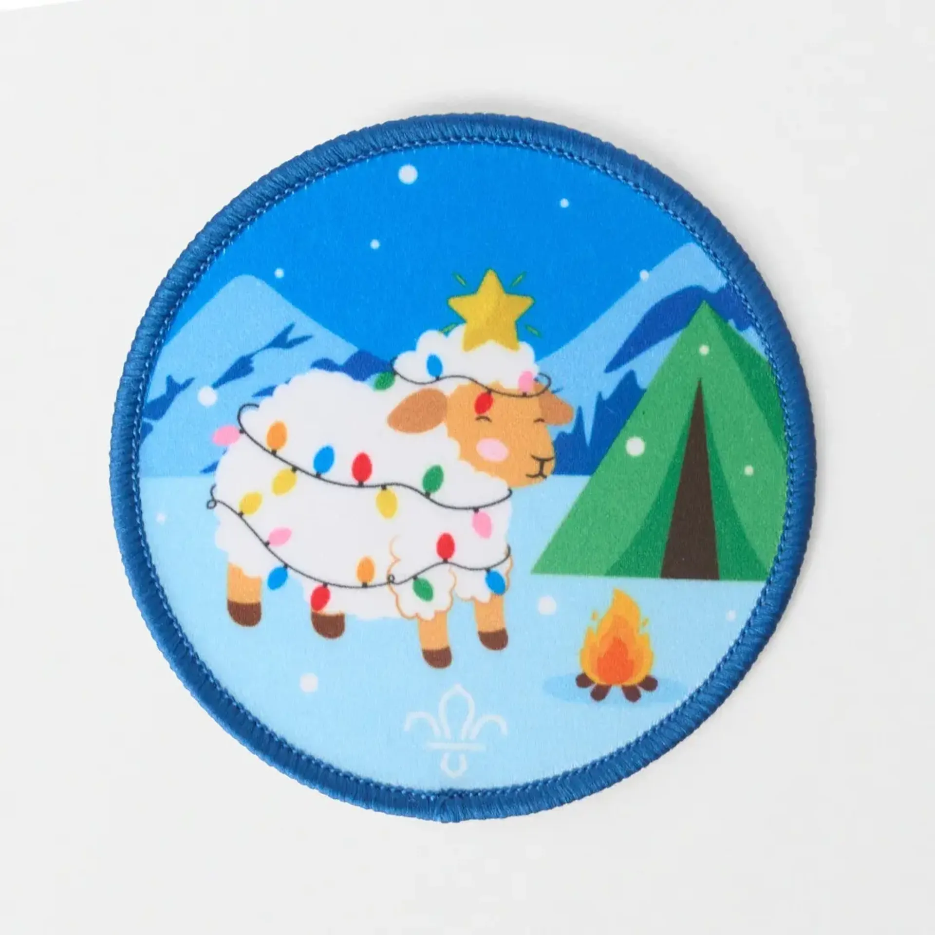 This colourful 'Fleece Navidad' woven Christmas badge features a fun design with sheep lit up in fairy lights, a wintry camping scene, and the Scouts fleur de lis. A 7cm sew-on printed blanket badge with a merrow border that can be added to camp blankets, ponchos, clothing and accessories.