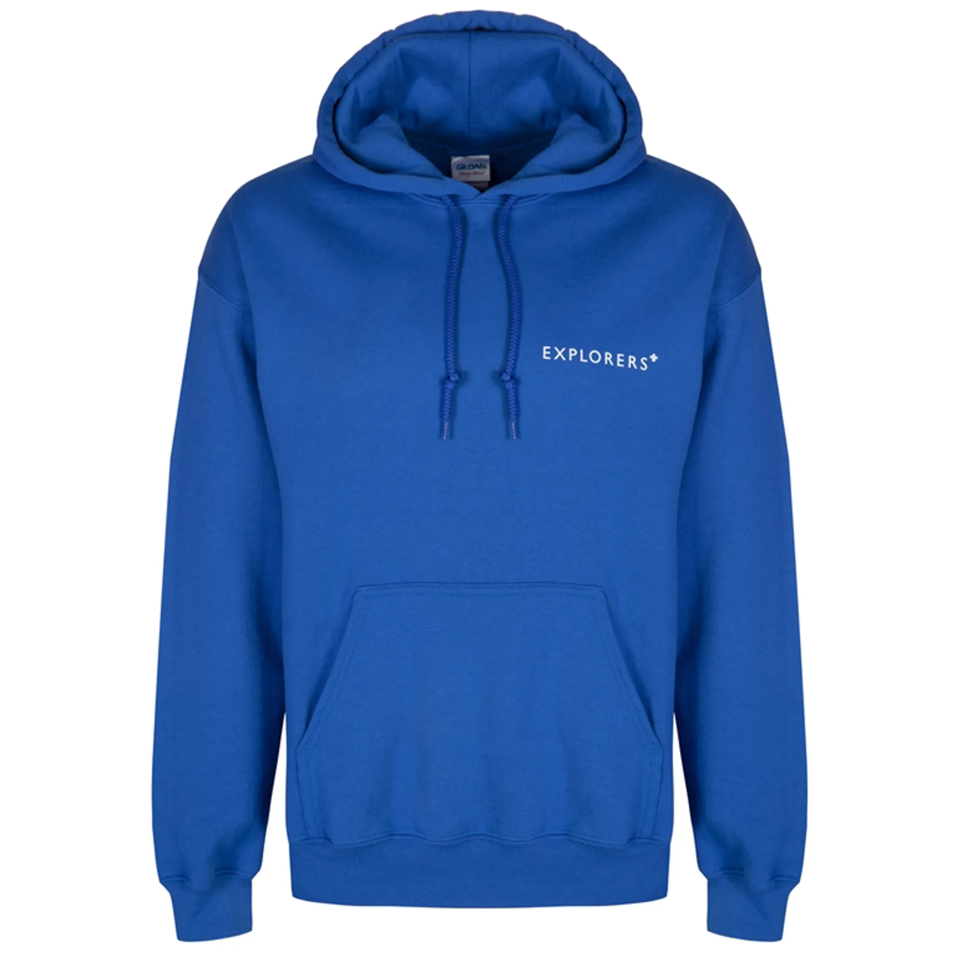 High quality mixed fabric adult hoodie in blue with a white Explorers logo and Scout activity print icons on reverse.